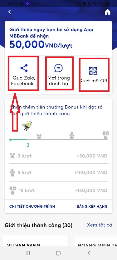 - Tặng ngay 50K cho người giới thiệu khi có bạn bè tải và đăng ký app MB Bank thành công